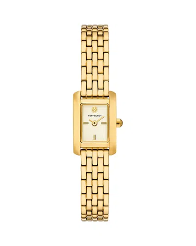 Simple, small and a singular classic, this mini version of Tory's Eleanor watch is the quietly elegant way to accessorize with its polished goldtone bracelet and case and ivory dial.Measurements: 17mm x 25mm case; 6.4mm case depth; 12mm band width.Strap/closure: Bracelet strap with deployant clasp closure.Movement: Two-hand quartz movement. Quartz movement: powered by a battery and features an internal electrical circuit to control the rate of the watch's ticking.Face: Mineral crystal face. Stainless steel/goldtone plate Imported