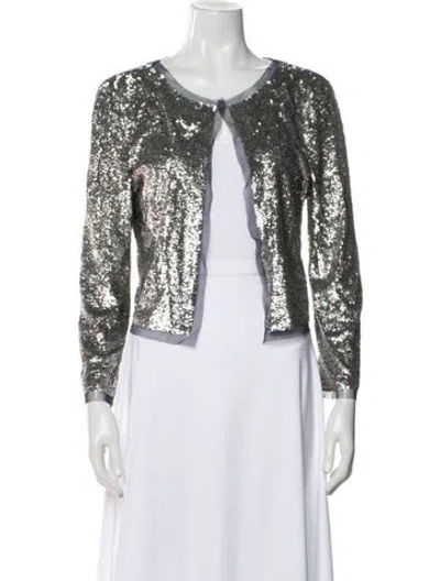 Tory Burch Nylon Evening Jacket Blue & Metallic Printed Sequin Embellishments & Collarless Patch Pockets & Open Front Fit: Jackets by Tory Burch typically fit true to size. | Tory Burch Nylon Printed Evening Jacket in Blue/Metallic, Women's M