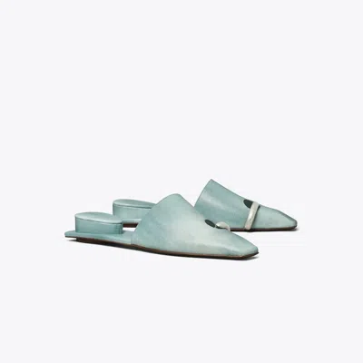 Surreal and innovative. A juxtaposition of shape and function. Crafted in sleek leather - designed to resemble washed denim, with brass hardware creating the illusion of a toe ring. The sculptural mule also features an inverted heel cushion, offering a comfortable sandal to dress up jeans or a skirt.Crafted in partnership with a Leather Working Group-certified tannery, supporting high standards in leather manufacturing and chemical management.