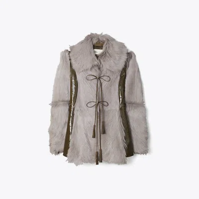 Channeling '70s glamour, this jacket is made from goat shearling with patent merino shearling panels, both treated at a renowned Italian tannery. Varying hair lengths add texture and movement to the Fall '25 runway style. Finished with a tasseled leather drawcord at the waist.