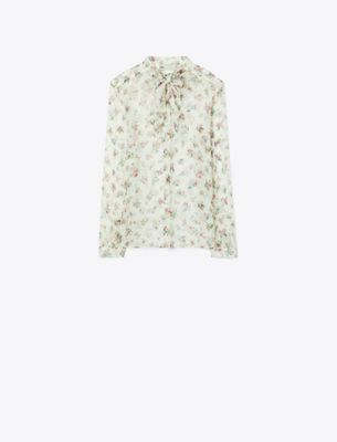 A style we revisit every season, the printed silk bow blouse is a wardrobe essential. Wear it alone or layered under the season's sweaters and jackets, tied in an off-kilter knot. Finished with mother-of-pearl buttons.