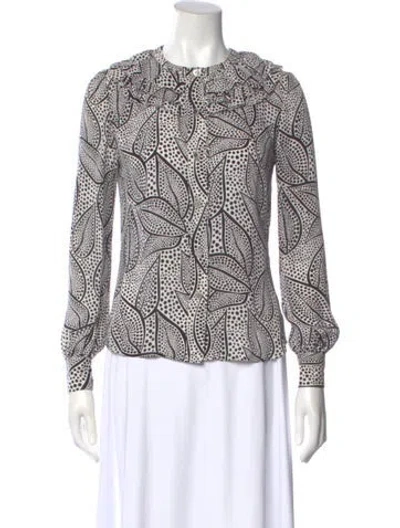 Tory Burch Silk Blouse Black & White Patterned Ruffle & Raw-Edge Accents Long Sleeve with Collar Button Closure at Front Designer Fit: Designed slim through chest and shoulders, recommend taking one size up. | Tory Burch Silk Patterned Blouse in Black/White, Women's US 2 | XS