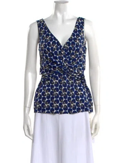 Tory Burch Silk Top Blue Patterned Sleeveless with V-Neck Designer Fit: Designed slim through chest and shoulders, recommend taking one size up. | Tory Burch Silk Patterned Top in Blue, Women's US 6 | M