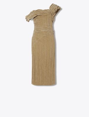 Seen on the Fall '25 runway, our one-shoulder dress is crafted in crushed cotton velvet from a heritage Italian mill, woven with metallic thread to create a subtly crinkled texture. Meticulous draping and boning at the bodice provide structure and support, creating a flattering silhouette.