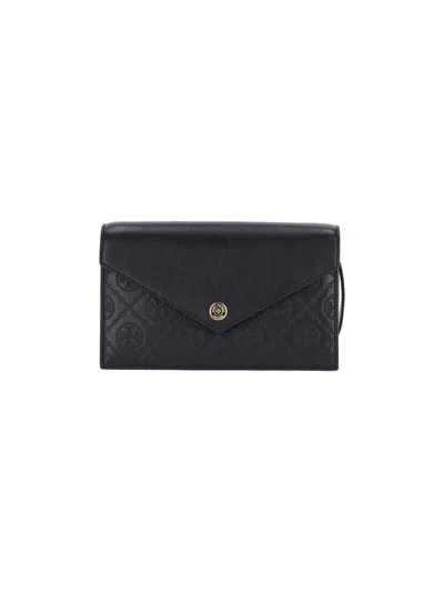The T Monogram chain wallet by Tory Burch embodies sophistication with its premium black textured leather and embossed logo pattern. This striking accessory includes a secure flap closure with a snap button, an adjustable chain strap made of luxurious gold-tone metal and leather, and multiple compartments for cards and cash. A back pocket and four interior card slots enhance its functionality, making it perfect for day-to-night transitions.- Premium black textured leather- Embossed logo pattern- Secure flap closure with snap button- Adjustable chain strap in gold-tone metal and leather- Multiple compartments for cards and cash- Back pocket- Four interior card slots