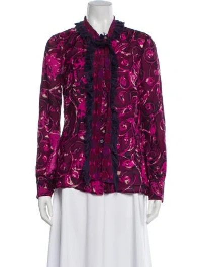 Tory Burch Wool Blouse Purple Patterned Fringe Trim Accent Long Sleeve with Collar Button Closure at Front Designer Fit: Designed slim through chest and shoulders, recommend taking one size up. | Tory Burch Wool Patterned Blouse in Purple, Women's US 8 | M