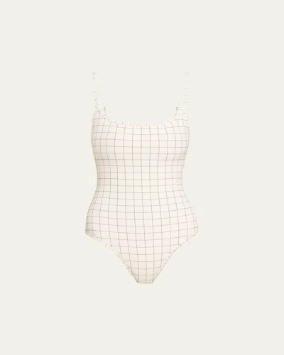 This sleek onepiece swimsuit by Toteme is patterned with a classic windowpane print Scoop neckline Adjustable straps Full seat coverage Nylon/polyamide/elastane Made in Portugal