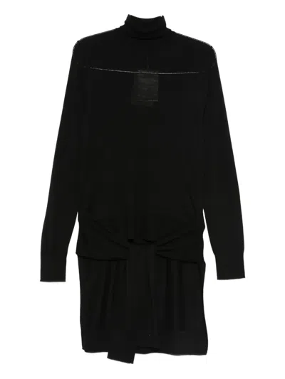black turtleneck neckline double sleeve detail tie-front fastening self-tie belt long sleeves