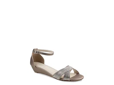 Touch Ups Iris - Women's Sandals : Champagne : Steal all the attention with your irresistibly gorgeous look by wearing the Touch Ups Iris sandals. ; Glossy polyurethane upper. ; Breathable synthetic lining and EVA insole. ; Adjustable buckle closure on the ankle strap. ; Open, round toe silhouette. ; Crisscross straps on the vamp with rhinestone embellishments. ; Closed-back design for added support. ; Low wedge heel. ; Durable TPR outsole. ; Imported. Measurements: Heel Height: 1 in. ; Weight of footwear is based on a single item, not a pair. | Touch Ups Iris Women's Sandals Champagne : 7.5 W, Synthetic