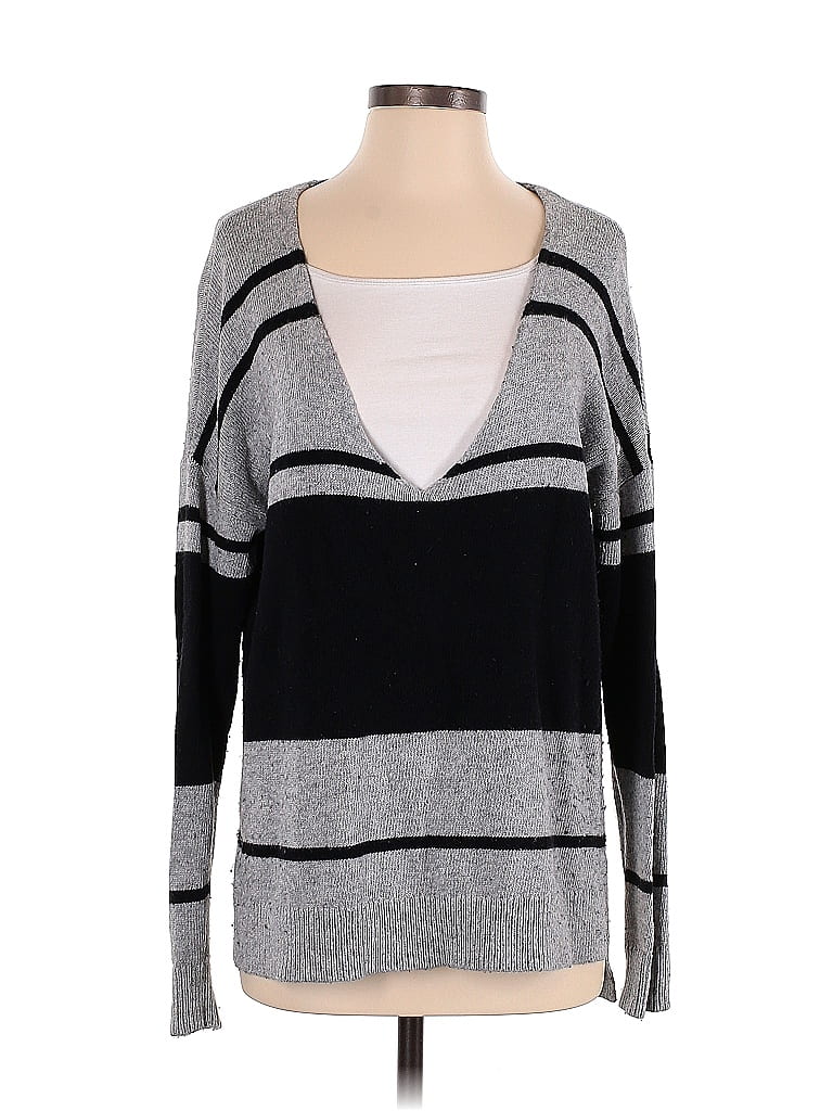 Treasure & Bond Pullover Sweater, Size: Small. Item Details: Gray, Stripes Pattern, Plunge Neckline, Long Sleeve, Women's Tops, Pima Cotton/Viscose/Nylon