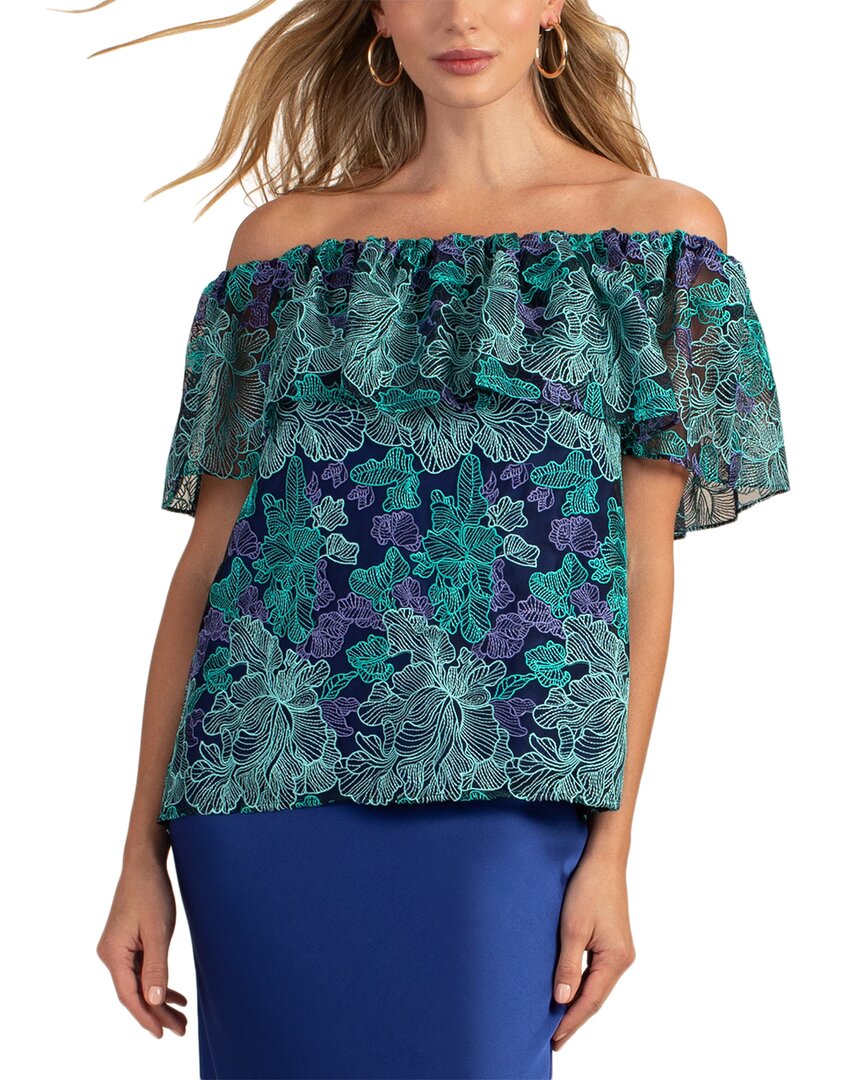 Introducing the Trina Turk Wisdom Top, a stunning addition to your wardrobe. This multicolor top features an embroidered off-the-shoulder ruffle design, a lined bodice, and sheer sleeves for a touch of sophistication. The approximate length of the top is 20 inches from shoulder to hem. Made from 100% polyester, this top is easy to care for with a simple hand wash. Slip-on styling makes it effortless to wear, and imported for quality craftsmanship. Elevate your style with the Trina Turk Wisdom Top today!