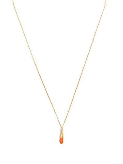 Gold-tone gold plated sterling silver Mini Pill Pendant Necklace from TRUE ROCKS featuring engraved logo, lobster claw fastening and adjustable-length chain.