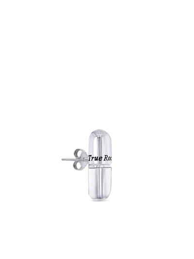 sterling silver pill stud earring from TRUE ROCKS featuring logo stamp to the front, butterfly fastening and for pierced ears. Please consider that this is sold as a single earring..