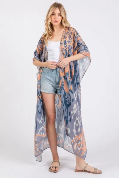 Description - Unveil your unique style with the Ocean Flame Kimono, a flowing statement piece that captures the free-spirited beauty of bohemian fashion. Featuring a striking blend of blue and orange tones in a mesmerizing abstract print, this long kimono is perfect for layering over swimwear, denim, or simple dresses. The lightweight sheer fabric drapes beautifully, offering movement and breathability. Whether you're beachside or brunch-bound, this versatile kimono adds effortless flair to your wardrobe.Key Features - Color - Rust Material - 100% Polyester Approximate size - 35" x 47.5" Sheer, lightweight chiffon-like fabric for breezy comfort Open-front, relaxed fit design for easy layering Flowing silhouette for effortless style and movement Product Details - Crafted from 100% polyester, this kimono features a lightweight, chiffon-like fabric that delivers breathability and graceful drape. Its open-front design and relaxed fit make it ideal for layering, while the vivid blue and orange print adds a bold, bohemian charm to any outfit.Size - For accurate sizing guidance, please review our size chart.