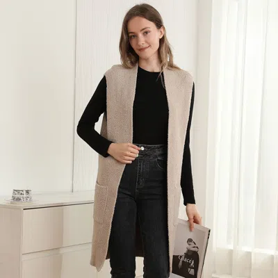 TRUEDAMES Solid Color Open Front Long Vest In Sand