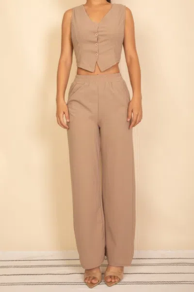 Description - This two-piece set blends structure and ease for a refined yet relaxed look. The sleeveless button-front vest features a flattering V-neckline, shaping seams, and an adjustable back tie for a custom fit. Paired with wide-leg pants that offer an elastic waistband and side pockets, this matching set is as comfortable as it is polished. Perfect for office days, weekend brunches, or casual evenings out, it's a versatile outfit that works dressed up or down.Features - 2-piece set - sleeveless vest and wide-leg pants Vest features shaping seams and adjustable back tie Pants include an elastic waistband for comfort Side pockets offer added functionality Soft structured fabric suitable for casual or dressy looks Versatile for multiple occasions Specifications - Color Options - Beige, Black, Rust, Taupe Model Height - 5'7" wearing size S Sizes - Please refer to the size chart for accurate sizing guidance