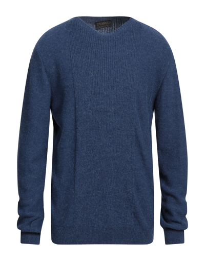 knitted, mélange, leather applications, brand logo, lightweight knit, solid colour with appliqués, round collar, long sleeves, no pockets, contains non-textile parts of animal origin , Color: Midnight blue , Size: S