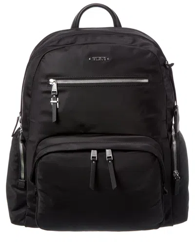 About The Brand: State-Of-The-Art Luggage To Get You There In Style. Color/Material: Black/Silver Nylon Design Details: Tumi Metal Logo With 2 Flat Dot Detailing. Double Zip Main Compartment Opening. Single Zipper To Computer Compartment. Leather Top Handle. 1-Front Zipper Pocket With Metal Detail. 1-U-Zip Pocket With Double Zippers. 1-Side Water Bottle Pocket ( Water Proof Lining On Left Side With Grommet). 1- Side Zipper Pocket On Right Side. 1- Quick Access Media Pocket With Mag Snap (Behind Right Side Zipper Pocket). Decorative D-Ring W/Hanging Monogrammable Voyageur Leather Dangler W/ Key Ring Detail. Aab Sleeve On Back. Padded & Adjustable Webbing Backpack Straps Interior Design Details: Tumi Story Patch 1- Ipad Pocket 1-Zipper Pocket ( Tracer Located Inside) 2-Open Pocket Measures 12In Wide X 17In High X 5.5In Deep Zipper Closure Imported Please Note: All Measurements Were Taken By Hand And Are Approximate; Slight Variations May Occur.