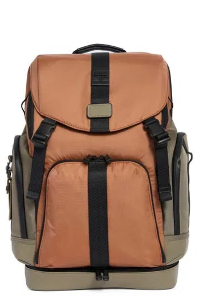 A spacious backpack built from durable nylon fabric is designed with a smart array of interior and exterior pockets to keep you organized for school, work or travel. An Add-A-Bag sleeve lets you easily attach it to your carry-on handle for seamless on-the-go convenience. 20" x 12 1/2" x 7" 4.2 lb. Front flap closure Top carry handle; adjustable backpack straps<br type="_moz"> Exterior has zip pockets Interior has key leash, 2 pen loops, business card pocket, 2 zipper pockets, 2 media pockets, 1 tablet pocket<br type="_moz"> This bag includes Tumi Tracer®, an exclusive, complimentary program that helps reunite lost or stolen bags with their rightful owners using a one-of-a-kind 20-digit number affixed to the bag Nylon, with leather trim Imported