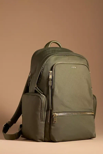 Nylon, leather; polyester lining Double-zip entry to main compartment Zip entry to padded laptop compartment Leather top handle Front U-zip pocket Two front zip pockets Side zip pocket Side double-zip water-resistant water bottle pocket Padded adjustable backpack straps Quick-access phone pocket TUMI Tracer® Two inner media pockets One inner leather card pocket Imported Celina Backpack by TUMI in Green, Women's, Polyester/Nylon/Leather at Anthropologie