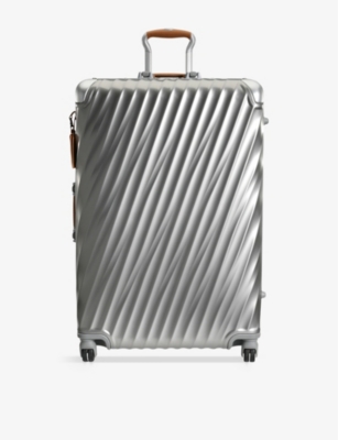 TUMI titanium hard-shell suitcase100% titaniumFrame-system openingRetractable top and side carry handles, three-stage telescoping handle system, two integrated TSA combination locks, protective bumpers, luggage tag, four dual-spinning wheels, four metal feet, interior zipped divider, two interior mesh pockets, compression straps, hanger bracket, interior card pocketHeight 77.5cm, width 52cm, depth 28cmWeight 7.81kgWipe with a clean, dry cloth