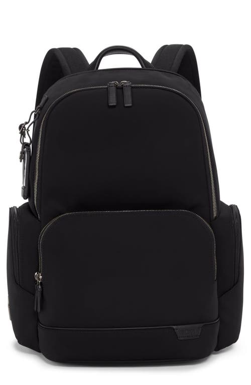 This spacious backpack is designed for everyday convenience and is outfitted with multiple pockets both inside and out to meet your daily organizational needs. It's equipped with an Add-a-Bag pass-through slot in the mesh-padded back that works with telescoping handles of compatible Tumi luggage for easy off-the-shoulders toting as a carry-on. This bag includes Tumi Tracer®, an exclusive, complimentary program that helps reunite lost or stolen bags with their rightful owners using a one-of-a-kind 20-digit number affixed to the bag Two-way zip closure Top carry handle; mesh-padded adjustable shoulder straps with D-ring clips Exterior front zip pockets; front phone slip pocket; side zip pockets; back quick-access pocket with hidden magnetic snap; luggage tag Interior zip and wall pockets; two card slots; two pen loops; key leash; padded compartment fits up to a 15" PC laptop or 16" Macbook; padded tablet compartment Ballistic nylon with leather trim Imported