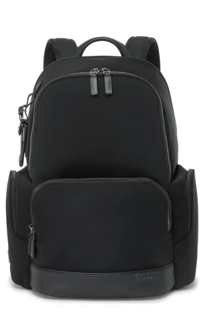 This spacious backpack is designed for everyday convenience and is outfitted with multiple pockets both inside and out to meet your daily organizational needs. It's equipped with an Add-a-Bag pass-through slot in the mesh-padded back that works with telescoping handles of compatible Tumi luggage for easy off-the-shoulders toting as a carry-on. This bag includes Tumi Tracer®, an exclusive, complimentary program that helps reunite lost or stolen bags with their rightful owners using a one-of-a-kind 20-digit number affixed to the bag Two-way zip closure Top carry handle; mesh-padded adjustable shoulder straps with D-ring clips Exterior front zip pockets; front phone slip pocket; side zip pockets; back quick-access pocket with hidden magnetic snap; luggage tag Interior zip and wall pockets; two card slots; two pen loops; key leash; padded compartment fits up to a 15" PC laptop or 16" Macbook; padded tablet compartment Ballistic nylon with leather trim Imported