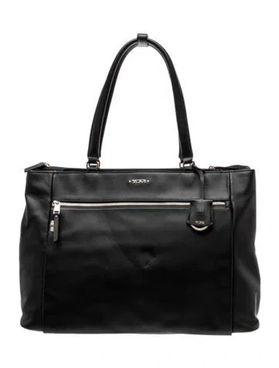 Tumi Shoulder Bag Black Leather Gold-Tone Hardware Flat Handles & Dual Shoulder Straps Leather Trim Embellishment & Three Exterior Pockets Nylon Lining with Card Slots Zip Closure at Top Protective Feet at Base Includes Dust Bag Unfortunately, due to restrictions, this item may not be eligible for shipping in all areas. | Tumi Leather Shoulder Bag in Black