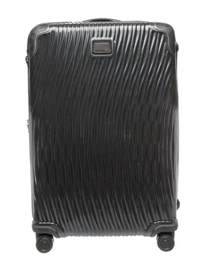 Men's tumis black plastic suitcase, silver hardware, leather trim, handle at top and side, protective feet at base. | Tumi black suitcase in Black