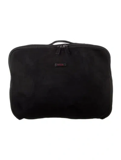 Black nylon Tumi travel square with mesh and leather accents and zip closure at top. | Tumi Mesh Compact Travel Accessory in Black