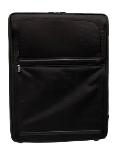 Black nylon Tumi suitcase with hand strap on side and top, retractable handle at top, wheels on bottom, dual exterior pockets, single interior pocket and zip closure. | Tumi Nylon Suitcase in Black