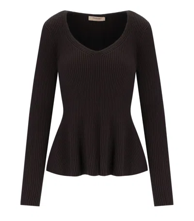 Twinset jumper made from a viscose blend with a ribbed pattern in shades of brown. It features a soft V-neckline, a small slit at the sleeve cuffs, and a jeweled logo on the back. Slim fit. Composition: 43% viscose, 42% polyamide, 15% wool.