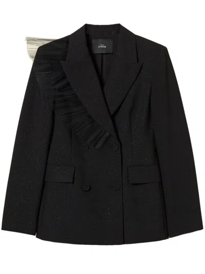 black double-breasted button fastening tulle panel ruffled detailing two side flap pockets notched lapels long sleeves straight hem
