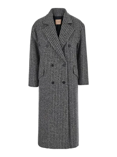 TWINSET Grey Double-breasted Coat With With Fishbone Motif In Wool Blend Woman In Gray