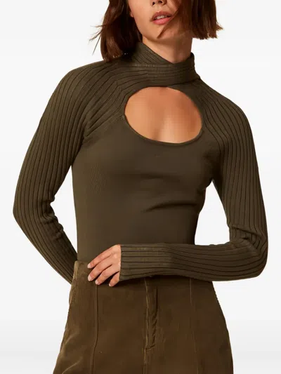 olive green mock neck cut-out detail ribbed texture long sleeves
