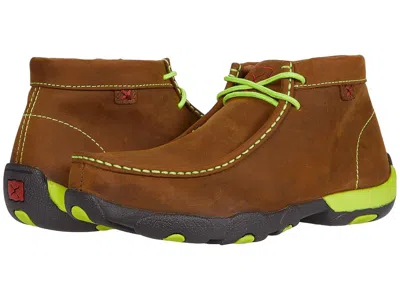 Twisted X Work MDMST02 - Men's Shoes : Distressed Saddle/Neon Yellow : Based on the signature Twisted X driving mocs, the MDMST02 steel-toe chukka boot has a handcrafted, genuine full-grain leather upper and provides job-site protection in a more casual moc toe silhouette. ; Lace-up work chukka with a steel safety toe that meets or exceeds ANSI standards ASTM F2413-18 M/I/C, EH (Electrical Hazard) safety standards. ; Cushioned collar and tongue for added comfort. ; Breathable mesh lining. ; Removable, moisture-wicking, machine washable molded footbed. ; XD insole uses a composite construction with foot-mapped zones to improve stability and in-shoe traction. ; Durable, molded rubber outsole for reliable oil-resistant and slip-resistant grip meets ASTM F1677-05 standard. ; Imported. Measurements: ; Heel Height: 1 in ; Weight: 1 lb 7 oz ; Product measurements were taken using size 7, width M. Please note that measurements may vary by size. | Twisted X Work MDMST02 Men's Shoes Distressed Saddle/Neon Yellow : 11 W, Leather