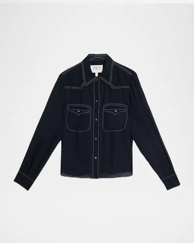 TWP Carter Shirt With Topstitching In Silk Georgette In Blue