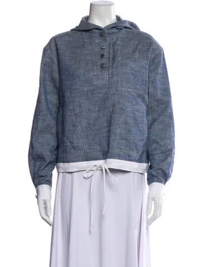 TWP Denim Jacket Blue & White With Hood Pleated & Grosgrain Accents Collarless Front Pocket & Button Closure Fit: Jackets by TWP typically fit true to size. | TWP Denim Jacket w/ Tags in Blue/White, Women's S