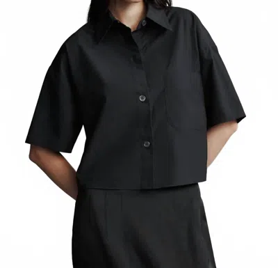 A classic button down shirt that will never go out of style.Embrace modern elegance with the Hazlewood Top by TWP, a cropped shirt tailored from structured, crisp cotton in a solid black hue. Designed with short, wide sleeves, it features a spread collar, chest patch pocket, and a stylish button closure for a refined look. Material - 100% Cotton. Perfectly pairs with a coordinating black maxi skirt for a chic holiday party ensemble.