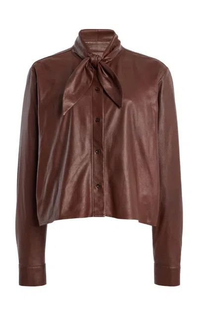 Like a best-kept secret among the fashion savvy; TWP has spread only by word of mouth. “It’s the insider resource for wardrobing: tailored pants and shirting from Italian fabrics at unbeatable price points. The type of brand you’ll be so pleased you discovered—and your friends will thank you too; says LSD.Long sleeved button down in 100% Italian lamb leather; with a neck tie at the collar. The Shirt with Tie Insert has a boxy silhouette. Complete with a button up placket.