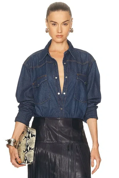 TWP OG Supersized Button Down Top in Dark Stone - Blue. Size XS/S (also in M/L). 100% cotton. Made in USA. Hand wash cold. Front snap button closure. Lightweight denim fabric. Dual snap-flap breast pockets. TWPF-WS1. 51537-W416. About the designer: