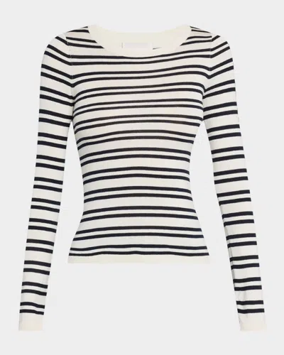 TWP fullfashioned striped knit top in a ribbed finish Approx. 23.3"L from shoulder to hem Crew neckline Long sleeves Secondskin fit Hip length Pullover style Mulberry silk/cotton Dry clean Made in USA from imported materials