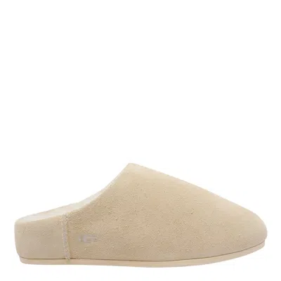Ugg 'Elea' cream suede leather mules with round toe, slip-on fit, embossed logo on the side, shearling lining, rubber sole. - Sole: 100% rubber - Shearling lining