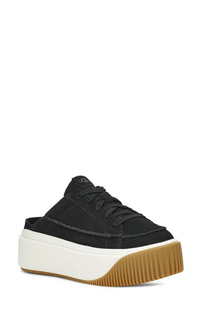 A sky-high platform boosts this chunky mule pairing cozy rib-knit insets with dapper suede elements to bridge the divide between sporty and refined. 2 1/4" platform (size 8.5) Textile and leather upper/textile lining/rubber sole Imported