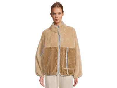 UGG Marlene Sherpa Jacket II - Women's Clothing : Sandstone / Ice Jam : Feel the snuggly pampered warmth wearing UGG Marlene Sherpa Jacket II. ; Relaxed fit. ; Stand collar. ; Full-zip closure. ; Long sleeves. ; Pockets: Front zipper pocket. Arm zipper pocket. ; UGG graphic exaggerated embossed faux suede zipper pull. ; Pop color knit binding along center front closure, hem, pocket zipper plackets, and cuffs. ; Fabric: Body: 100% polyester; Lining: 100% cotton. ; Machine wash, tumble dry. ; Imported. | UGG Marlene Sherpa Jacket II Women's Clothing Sandstone / Ice Jam : MD, Polyester/Faux Fur