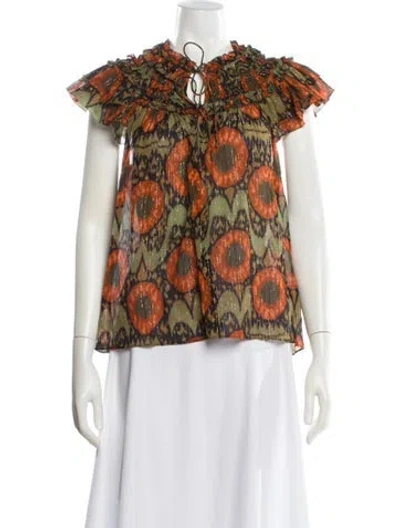 Ulla Johnson Blouse Green & Orange Patterned Short Sleeve with Tie Neck Designer Fit: Tops by Ulla Johnson typically fit true to size. | Ulla Johnson Patterned Tie Neck Blouse in Green/Orange, Women's US 8 | M