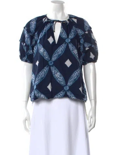Ulla Johnson Blouse Blue Patterned Ruffle Embellishment Short Sleeve with V-Neck Sash-Tie Closure at Front Designer Fit: Tops by Ulla Johnson typically fit true to size. | Ulla Johnson Patterned V-Neck Blouse in Blue, Women's US 6 | M