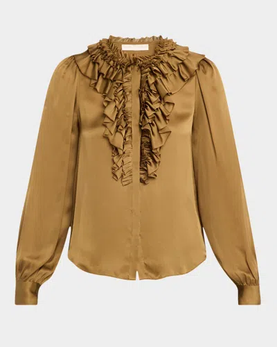 ULLA JOHNSON Rouen Silk Ruffle Front Blouse In Willow In Brown