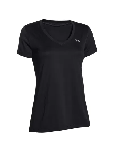 Under Armour Tech Short Sleeve V-Neck Solid - Women's Clothing : Black/White : ; ; ; All Under Armour Apparel features a tagless design or tear-away tag with no left-over pieces. ; Pair your jeans or trousers for a sporty look by wearing Under Armour Tech Short Sleeve V-Neck Solid tee. It features a pull-on style, V-neckline, and short sleeves. The straight hem and signature brand logo on the left shoulder gives it a subtle yet chic look. ; 100% polyester. ; Machine washable. ; Imported. Measurements: ; Length: 28 in ; Product measurements were taken using size XL (US 16). Please note that measurements may vary by size. | Under Armour Tech Short Sleeve V-Neck Solid Women's Clothing Black/White : 2XL (US 18), Polyester