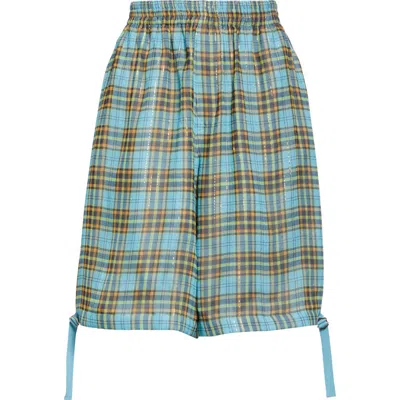 UNDERCOVER Metallic Stripe Plaid Silk Blend Twill Bermuda Shorts In Light Blue Check